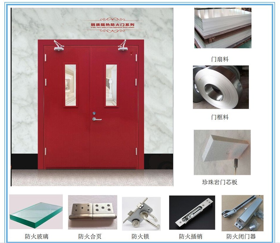 鋼質防火門門框、門扇分別采用寶鋼優質鍍鋅鋼板,框鋼板厚度1.2mm,門扇鋼板厚度 0.8mm,上下端采用1.2-1.5mm厚鋼板折成U型骨架焊接而成,連接合頁和閉門器處加襯板,鋼板厚度不低于3.0 mm。